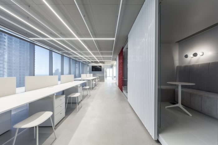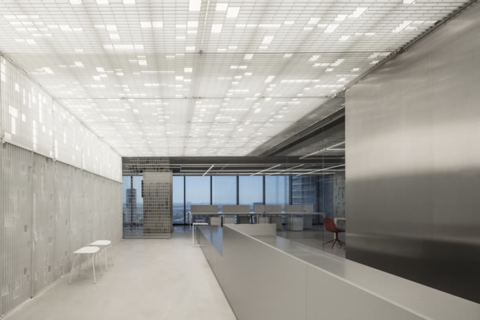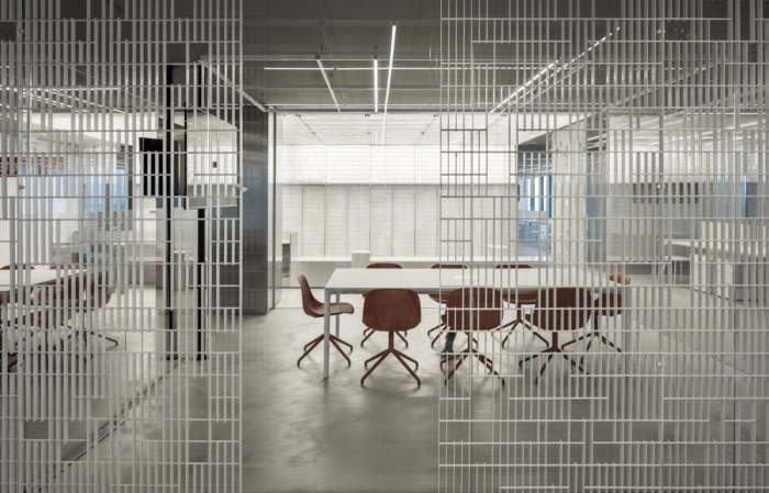 钢格栅被解开,以创造新的图案,并从简单的网格转变为工业蕾丝。这种编织隔墙产生分离而不堵塞空间。这种所谓的交织开放性,使人们能够对周围的城市景观有一个微妙的、分层的看法。白色波纹聚碳酸酯板被设计成一个更可靠的隔板,以提供更多的隐私。该空间的配色方案全部为白色和灰色,带有该公司品牌的红色色调。材料调色板结合了时尚和工业——立柱和墙壁的铝覆层,与混凝土地板和带有白色油漆饰面的隔墙并列,以及白色波纹聚碳酸酯面板的分裂焊接网格。#济南星空注册_星空(中国) #
