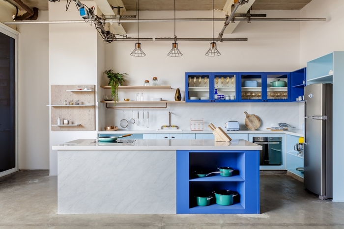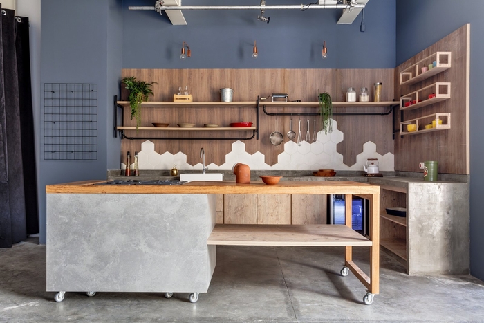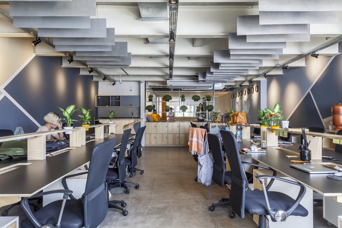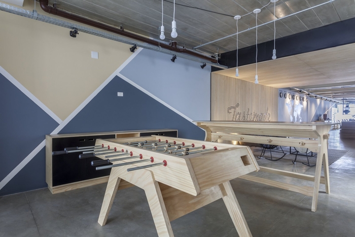 空间的照明已经很明显。它由带聚光灯的穿孔电缆槽组成。决定没有石膏衬里,但在桌子上做了一个木制衬里,作为声音打击器,以改善工作站的声音效果。地板上还有一个会议室和休闲空间,还有一张用胶合板制成的足球桌。#星空注册_星空(中国) 设计#