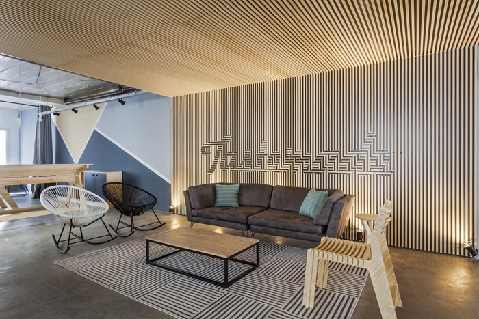 办公室位于一楼,环境非常凉爽,墙壁上覆盖着几何图形。当你进入这个空间时,你的注意力会被一块覆盖在墙壁和天花板上的大木板吸引。松木板条的垂直方向变成了水平方向,形成了公司的标志。#星空注册_星空(中国) 案例#